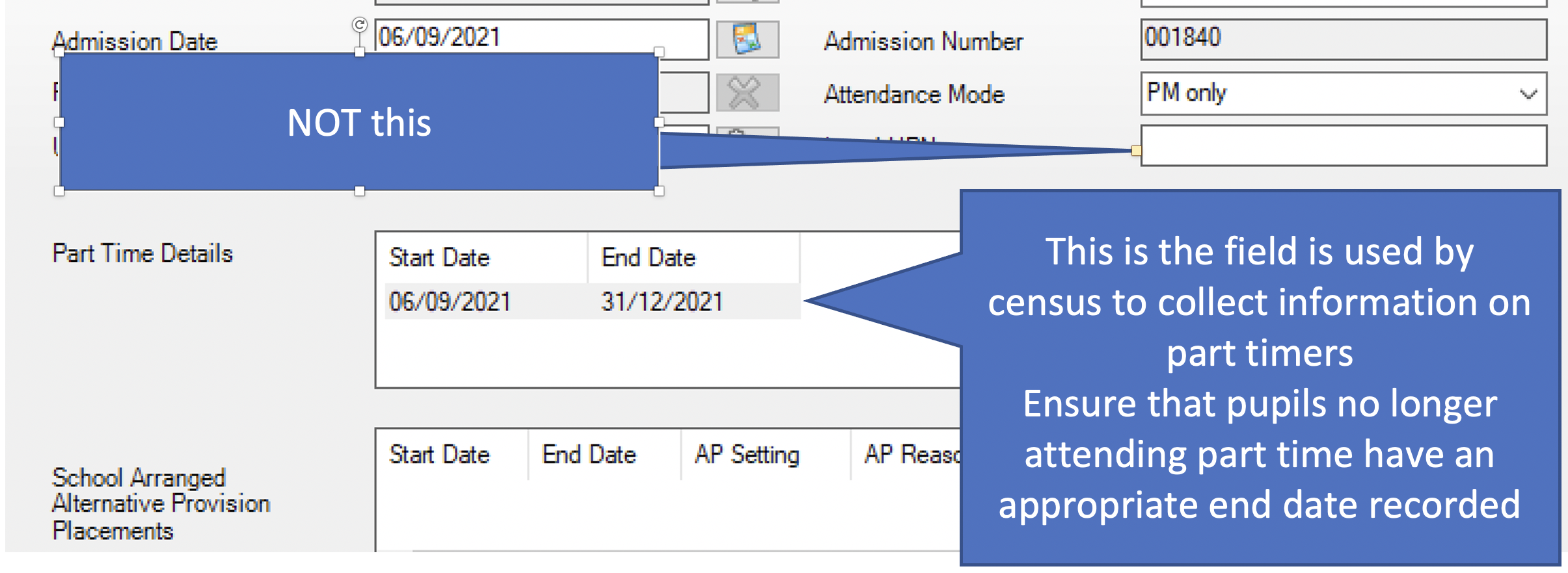 Use of the part time indicator has caused some confusion. Compulsory school aged pupils should never be on a part-time indicator. On rare occasions a medical condition or re-integration package may prevent a child from attending full time, but by agreeing to a part-time timetable the school is authorising the pupil absences. Therefore pupils of statutory school age must always be recorded in the Census as full-time.